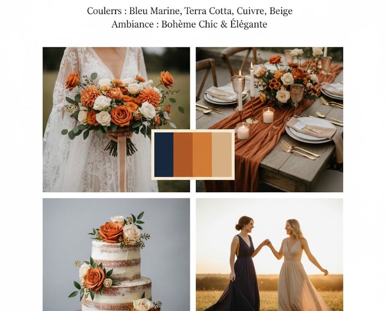 Pour compléter l'atmosphère de cette journée et la magie du Manoir de Penfao, nous avons conçu une palette de couleurs qui nous défini : Bleu Marine, Terra Cotta, Cuivre et Beige.